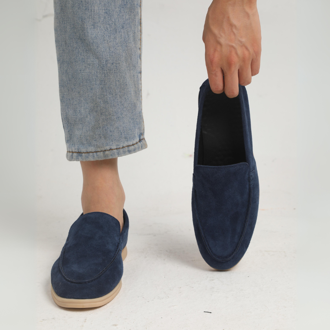 Loafers de Camurça Premium - Azul Marinho: Esses loafers versáteis combinam conforto e elegância, perfeitos para transitar da praia a um jantar ao pôr do sol.